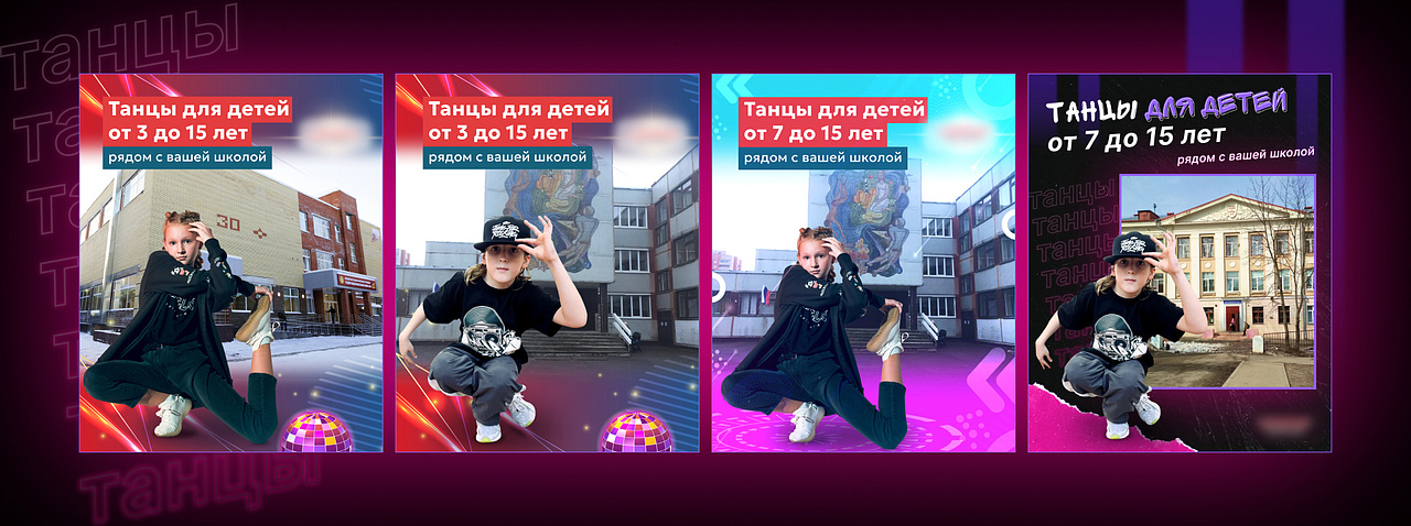 - Подготовлены креативы с танцующими детьми на фоне школ и детских садов