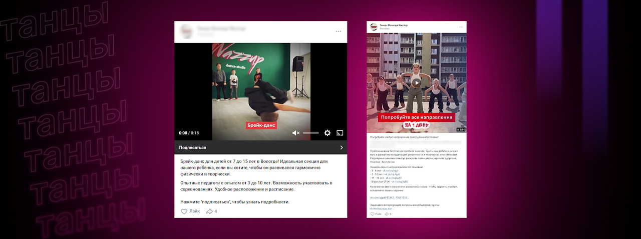 Для тех, кто уже взаимодействовал с рекламой, но не оставил заявку, запустили видеоролик на ретаргетинг. В ролике дети демонстрировали разные стили танца — это помогало показать атмосферу занятий и убедить родителей записать ребёнка. Такой мягкий «догоняющий» ретаргет дал хороший отклик — особенно среди старшей возрастной группы.
