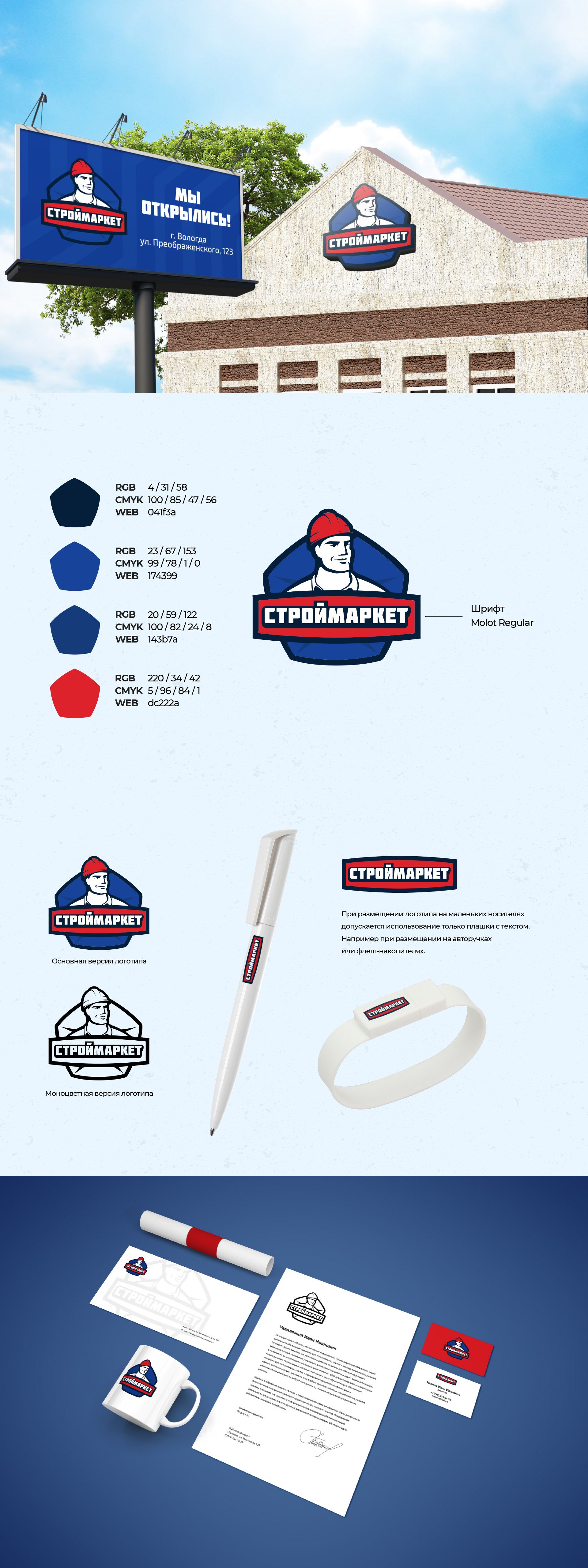 При разработке логотипа учитывались пожелания касательно его формы. В основе логотипа лежит знакомый многим знак качества, который использовался в СССР, что говорит о высоком качестве предлагаемой продукции. Силуэт логотипа универсальный — он идеально впишется в любую правильную геометрическую форму: круг, квадрат или треугольник. Выбор цветовой схемы основан на текущих графических материалах. В качестве персонажа выбран образ простого строителя, который знает своё дело. Образ вызывает доверие и ассоциируется с простыми людьми, посетителями магазина.