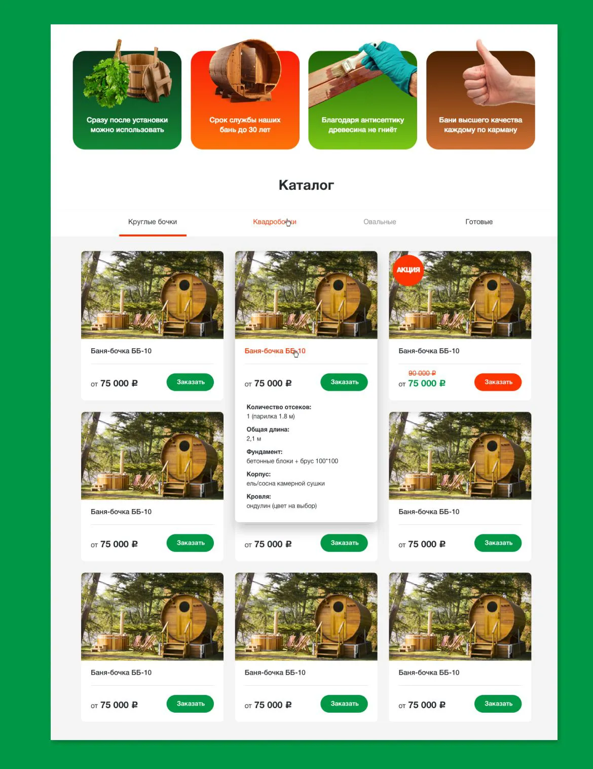 Для блока продукции разработаны удобные карточки, которые разворачиваются при наведении и можно посмотреть более подробную информацию о товаре.