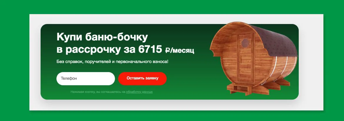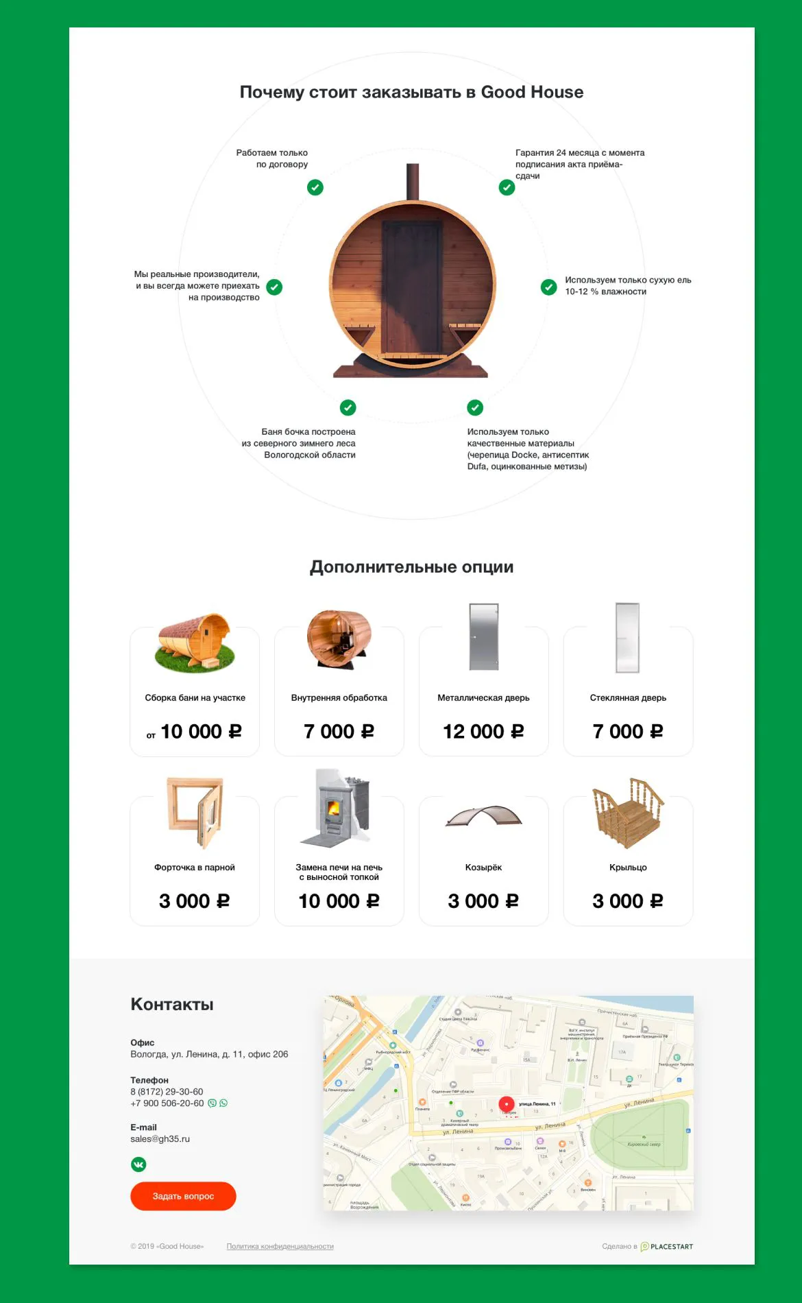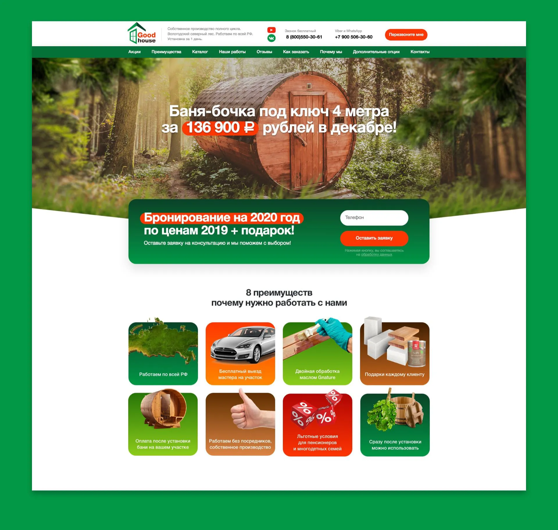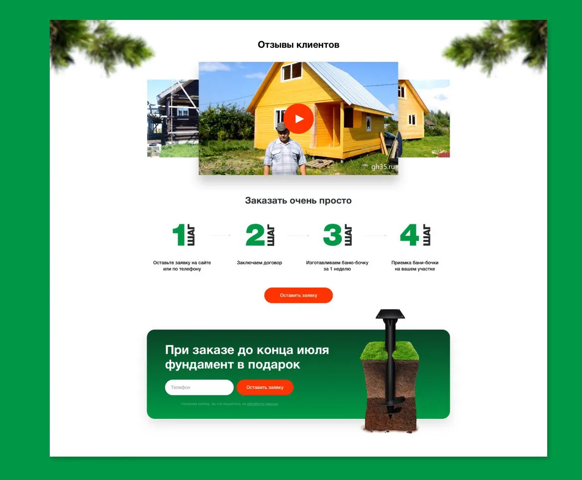На этом лендинге была проведена серьёзная аналитическая работа. Мы отслеживали статистику посещений несколько месяцев, тестируя различные варианты расположения блоков на первом экране.