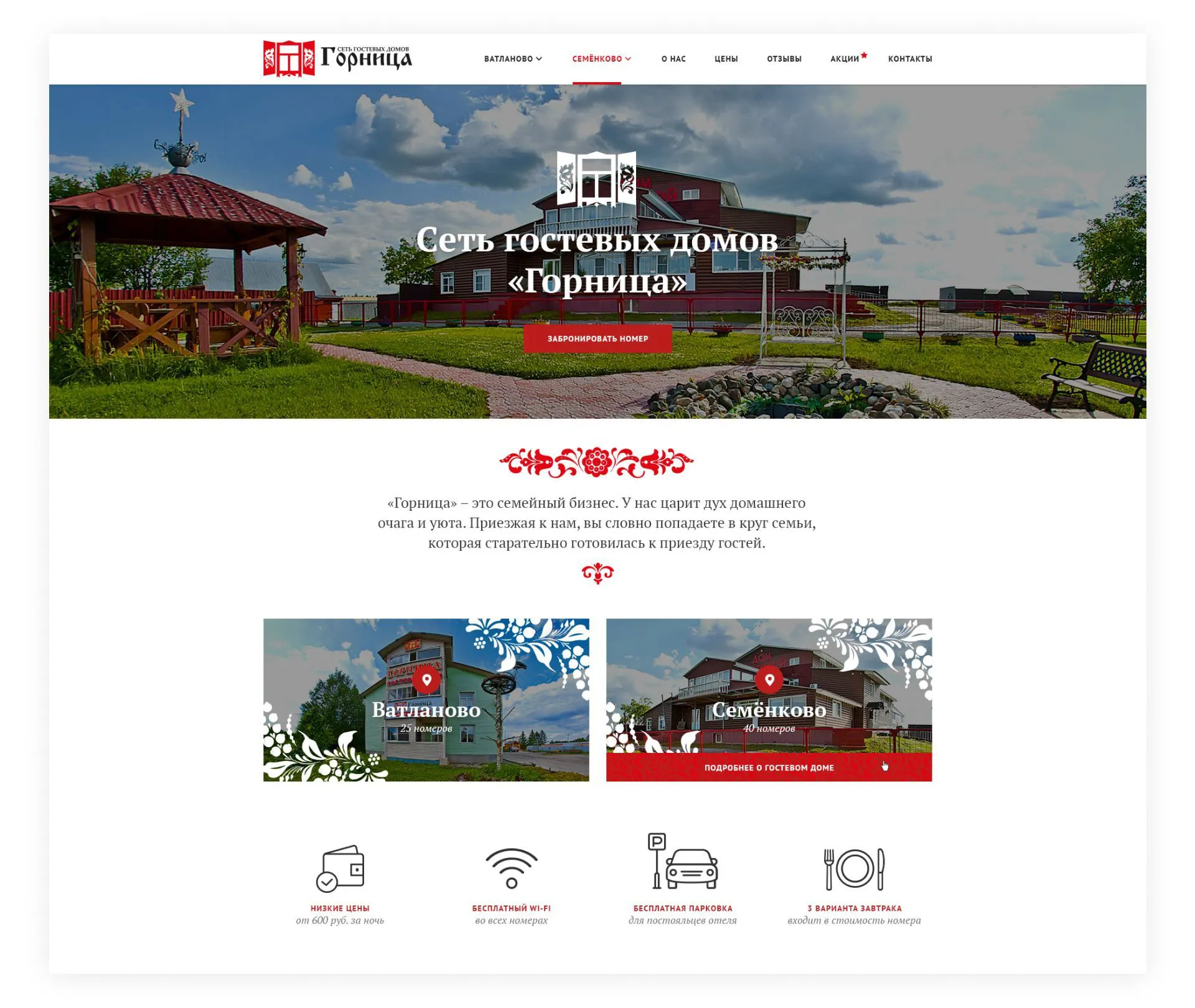 Сайт разработан для сети гостевых домов. Для тогочтобы быстро найти информацию по каждому из них, мы разместили их названия в шапке сайта и продублировали в отдельный блок. Сайт оформлен в едином стиле с использованием паттерна — орнамента.