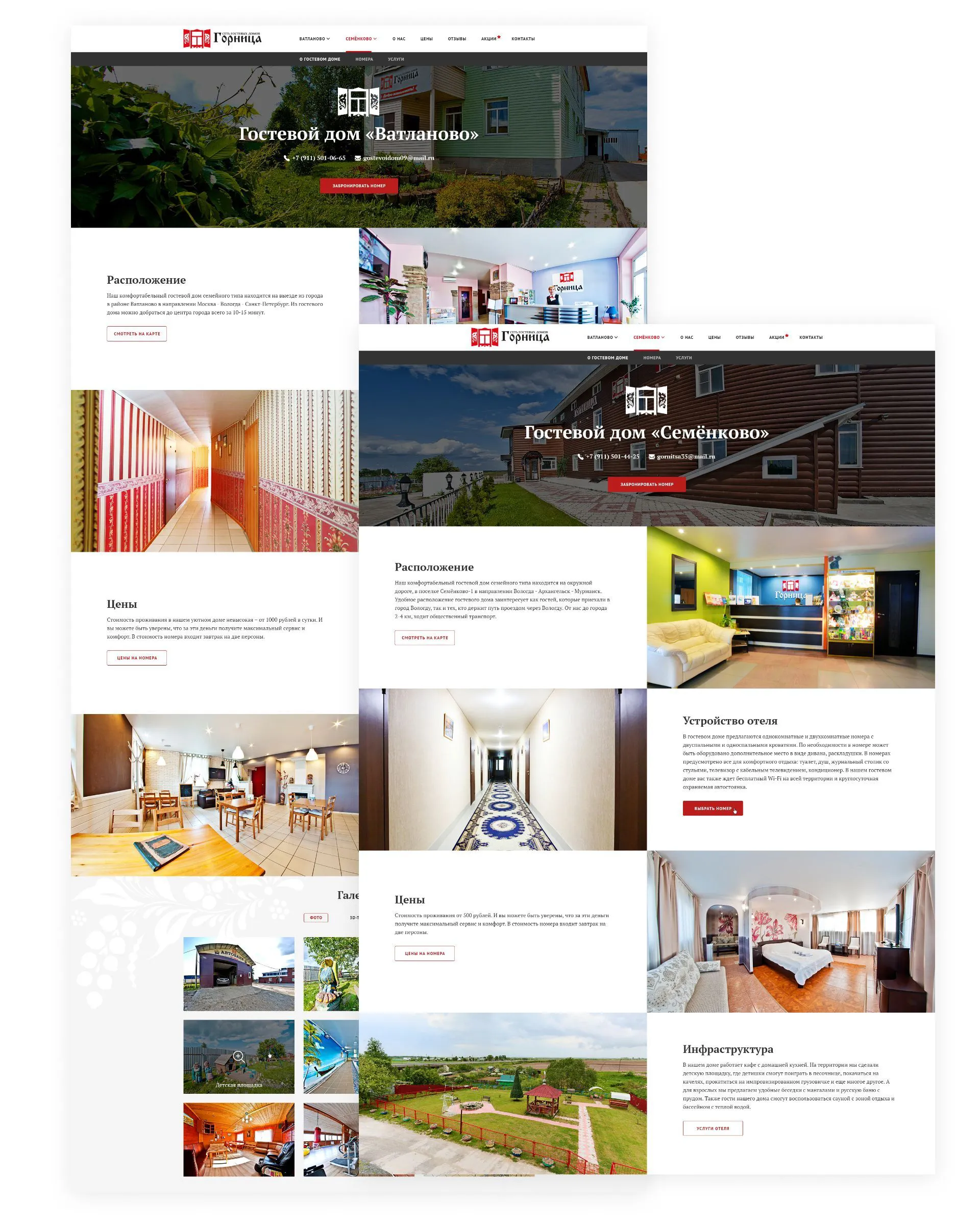 Для знакомства с гостевыми домами мы разработали индивидуальные информационные страницы. У клиента есть возможность узнать о месторасположении, устройстве отеля, оказываемых услугах и предварительно увидеть номера.