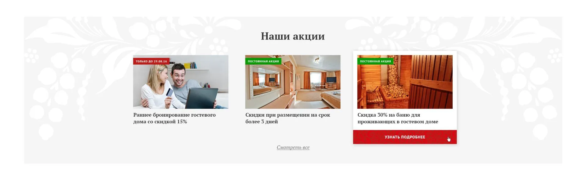 Для привлечения внимания к акциям мы создали отдельный блок. Так у клиента есть возможность ознакомиться с основными предложениями и сделать выбор в пользу одного из них в краткие сроки.