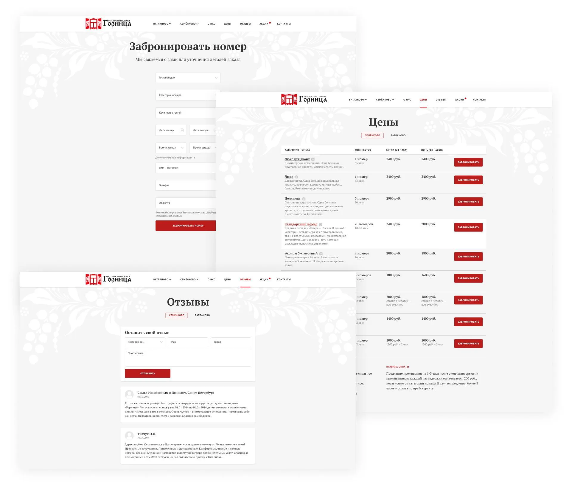 Мы разработали простую систему бронирования. Пользователь выбирает понравившийся номер и отправляет заполненную форму. Для повышения лояльности мы сделали страницу отзывов. У сайта есть свой собственный стиль, которого мы придерживались на протяжении всех страниц.