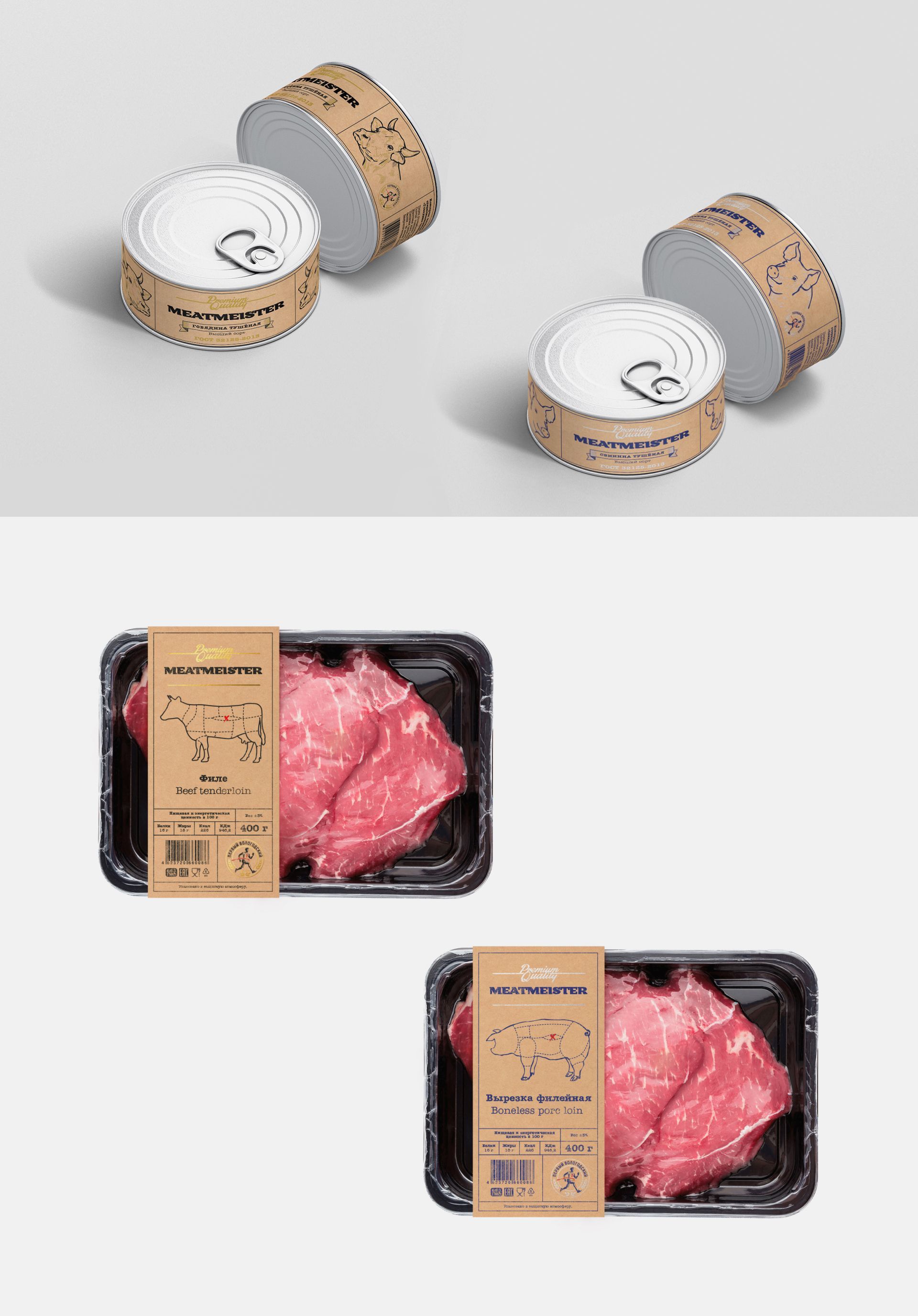 Разработана винтажная упаковка для разного вида мясной продукции. Благодаря тщательно разработанной концепции она выгодно отличается на фоне конкурентов. При этом сохранена максимальная простота — использовано минимум деталей, важная информация вынесена на лицевую сторону. Необычные шрифты выгодно выделяют продукт и вызывает эмоциональную привязанность. Чёткое соблюдение иерархии информации и гармоничная композиция сокращают время изучения продукта.